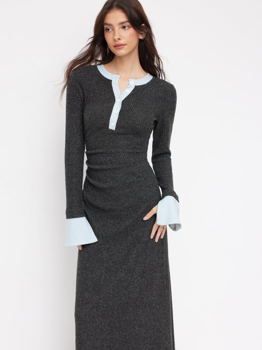 Textured Round Neck Long Sleeve Contrasting Binding Maxi Dress